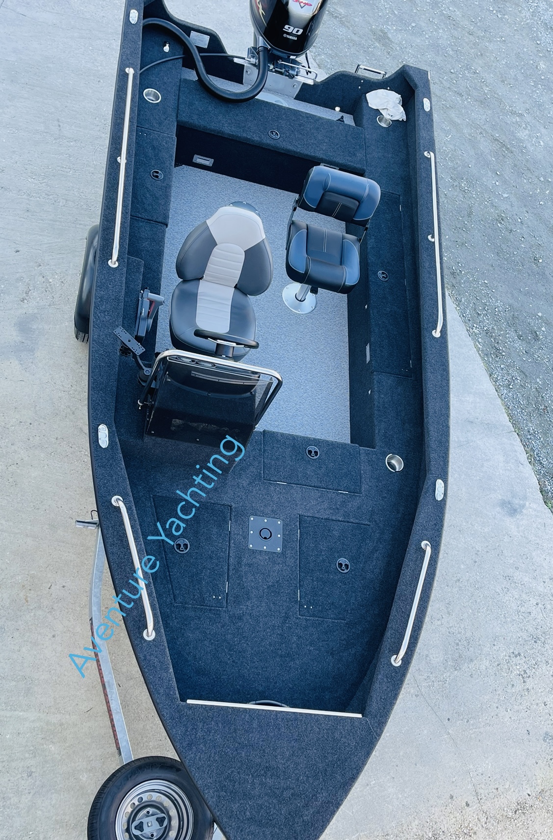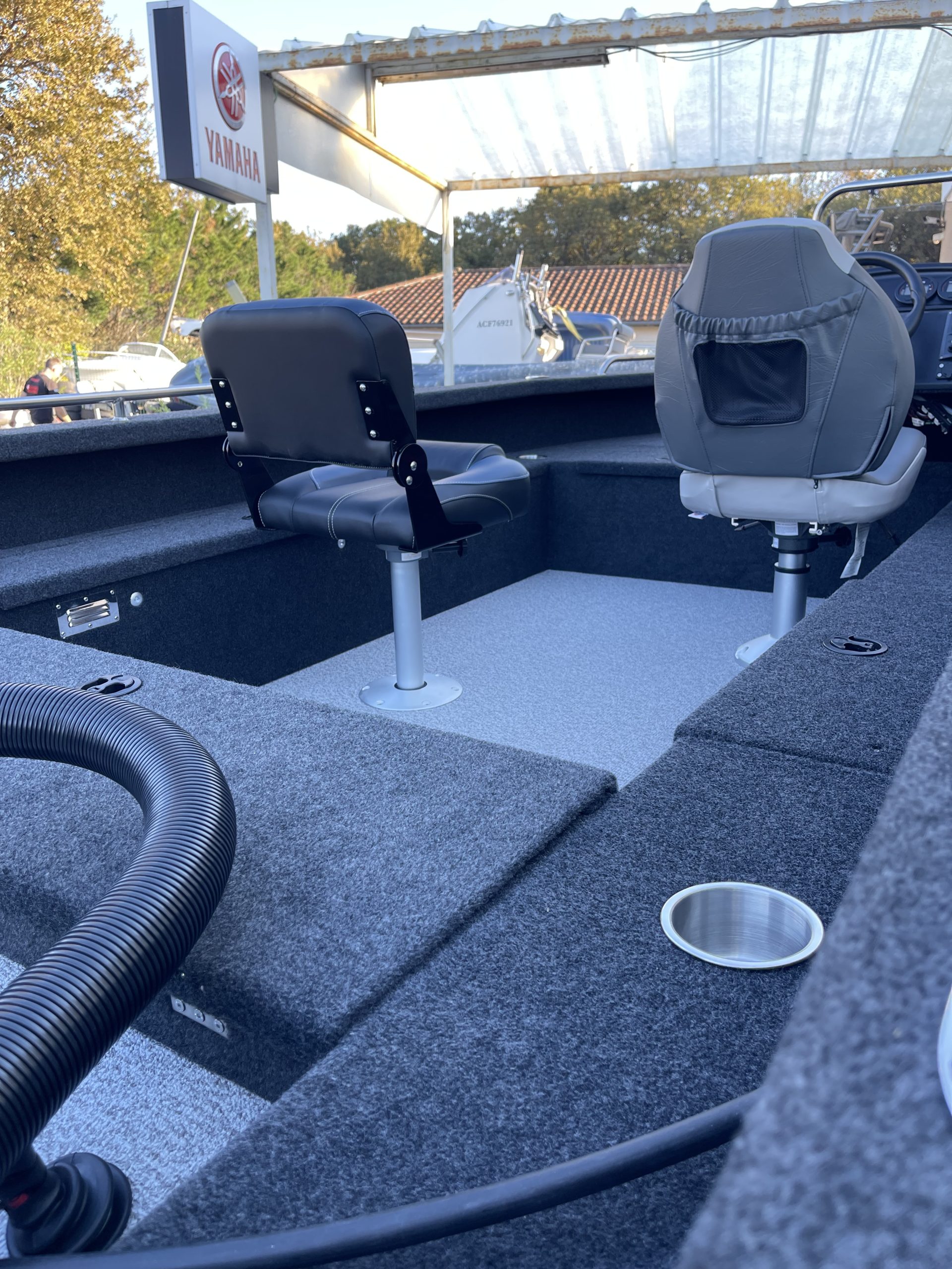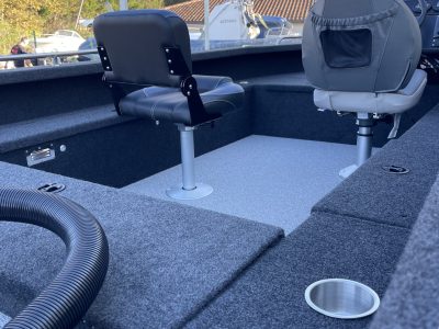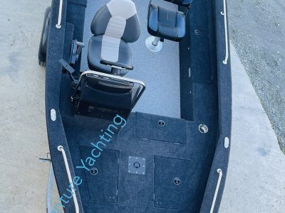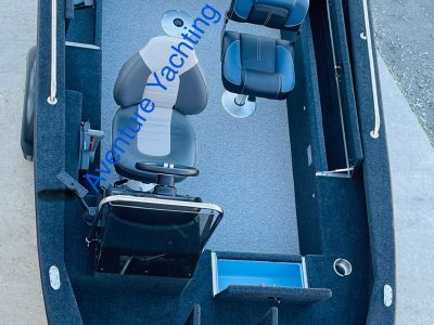 câbles, électricité complète avec panel électrique 6 inter, prise allum-cig et double USB, coupe-batterie , câblage complet, feux de navigation led(avant, arrière), Éclairage de pont led, pompe de cale électrique, pompe électrique pour vivier , 1 grand siège confort multi réglages pour le pilote + 1 siège complet avec 3 embase pour la pêche,