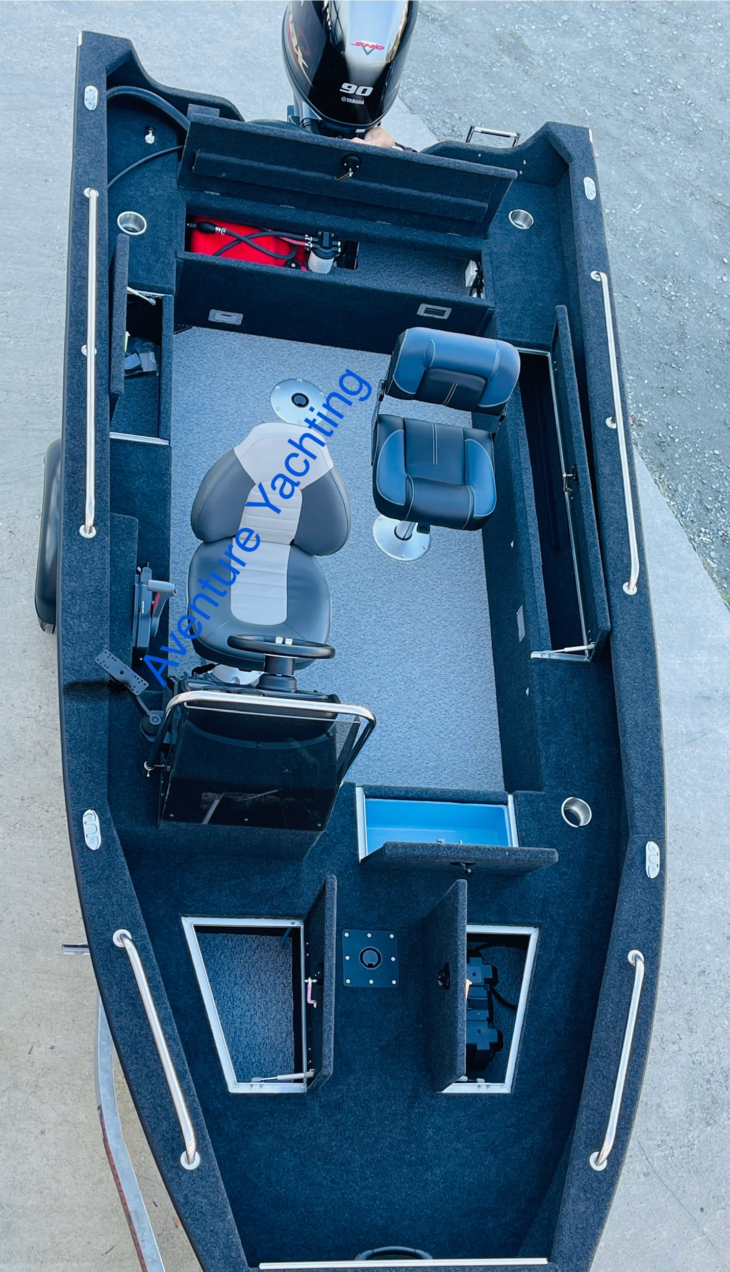 -Equipements: 4 coffres de rangement avec éclairage led interne et verrous à clés + 1 coffre à cannes longueur 300cm ( débouche dans le coffre avant ) Vérins à gaz sur les coffres, covering, Bâbord, Tribord et arrière, coque entièrement moussé ( mousse hydrofuge ), isolation complète du plancher, habillage moquette sur tous